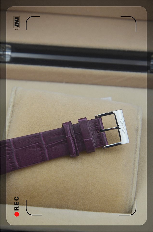 材質:高硬度耐磨藍寶石鏡面,全鋼錶殼,銀色錶圈,真皮錶帶,卡針扣,紫色錶盤,藍色錶針,羅馬刻度